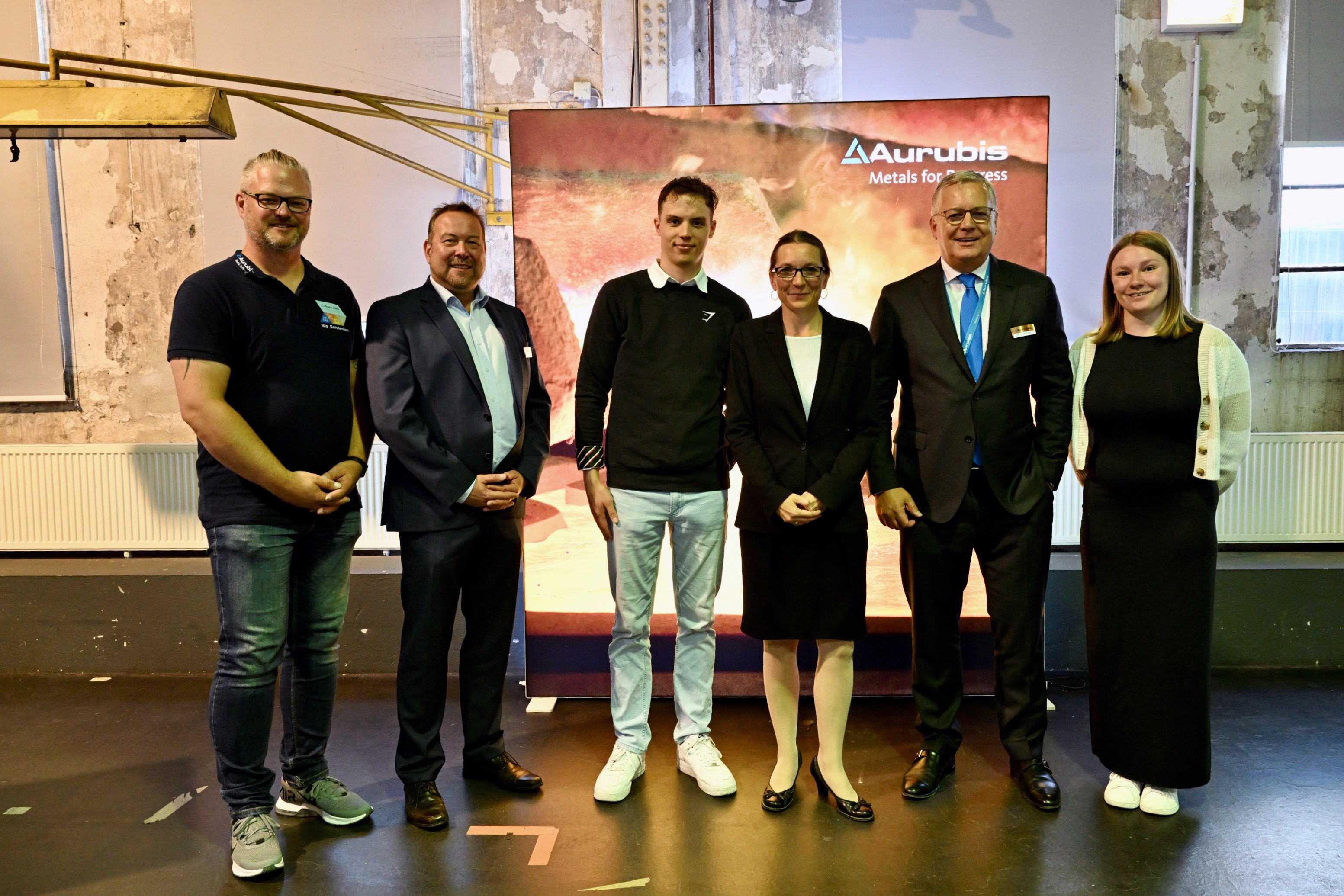 Press image: Apprentices with Aurubis representatives and Ksenija Bekeris